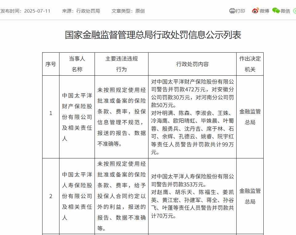 中国太平洋财产保险股份有限公司因未按规定使用保险条款、费率,投保信息管理混乱,报告数据不准确等问题,被警告并罚款472万元,同时其安徽、河南分公司也分别被罚款30万元和50万元,多名责任人被警告并罚款共计99万元。