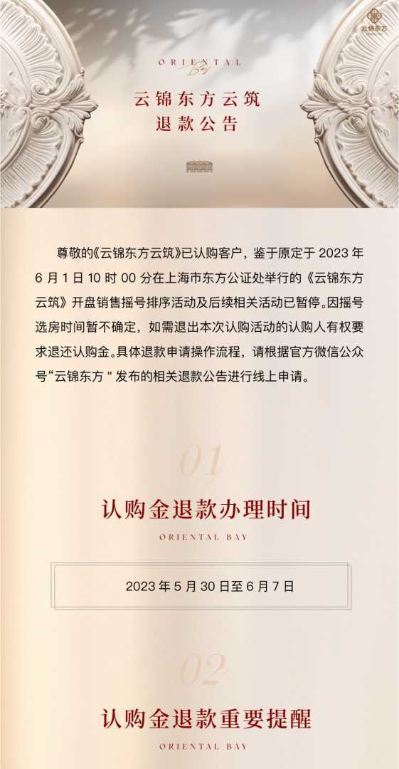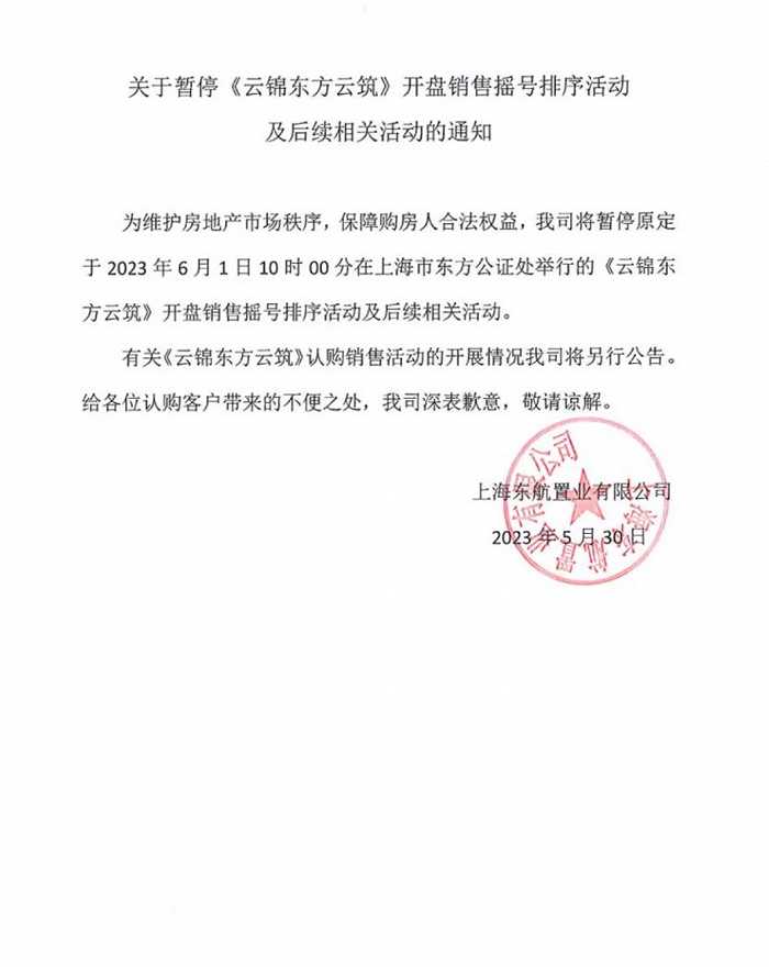 5月30日,上海东航置业有限公司正式发布了《暂停<云锦东方云筑>开盘销售摇号排序活动及后续相关活动的通知》。该通知旨在维护房地产市场的正常秩序,确保购房者的合法权益不受侵害,因此决定暂停原定于2023年6月1日10时在上海市东方公证处举行的《云锦东方云筑》开盘销售摇号排序及其后续活动。与此同时,开发商还发布了详细的认购金退款公告,为购房者提供明确的退款流程。