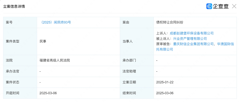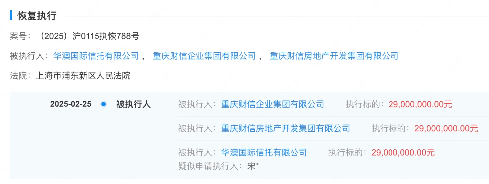 近日,财联社记者从中国执行信息网获悉,华澳国际信托有限公司(简称“华澳信托”)、重庆财信企业集团有限公司(简称“财信集团”)、重庆财信房地产开发集团有限公司(简称“财信地产”)均被法院列为被执行人,执行标的均为2900万元。这一消息透露出财信系的地产与金融板块之间存在密切关联,且均陷入困境。