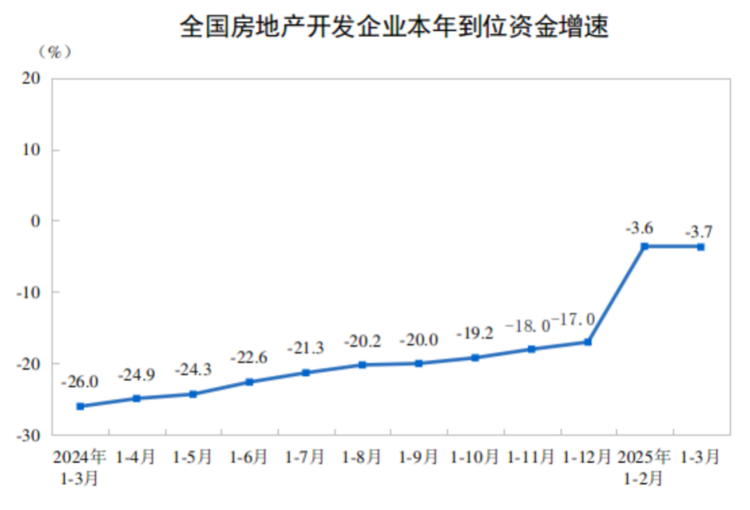 数据显示,1-3月份全国新建商品房销售面积同比降幅较去年全年收窄9.9个百分点,销售额同比降幅收窄15个百分点。房企到位资金中,国内企业贷款及个人按揭贷款同比降幅也有所收窄。这表明房地产市场交易持续改善,房企经营状况有所好转,政策效果持续显现。