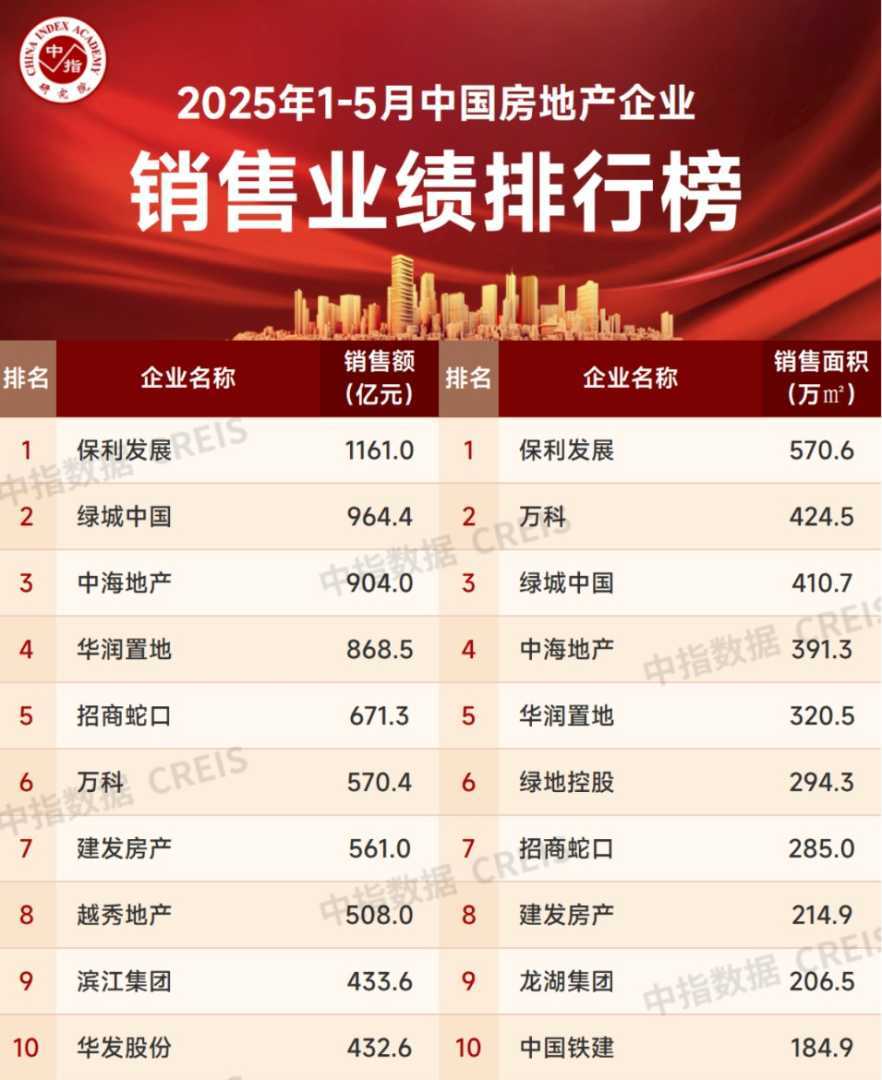 其中,保利发展以1161亿元继续领跑,同时也成为今年首个销售额破千亿元的房企;绿城中国以964.4亿元紧随其后,中海地产以904亿元取代华润置地上升至第三位。保利发展、绿城中国和中海地产在5月的销售额表现突出。