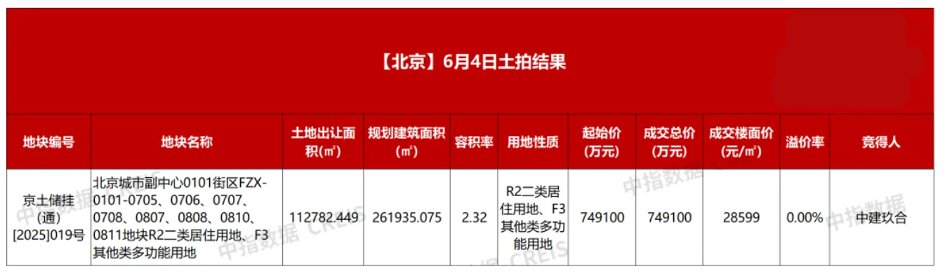 6月4日,北京通州0101街区FZX-0101-0705、0706、0707、0708等地块正式出让,中建玖合以74.91亿元底价竞得,住宅楼面价约3.2万元/平方米。