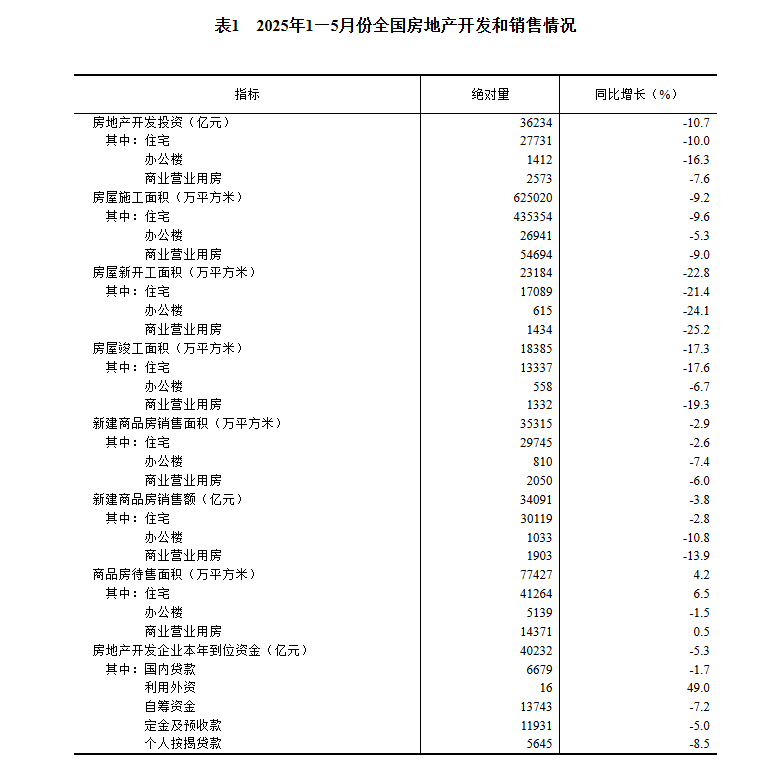 国家统计局数据显示,1—5月份全国房地产开发投资同比下降10.7%,房屋施工面积同比下降9.2%,新建商品房销售面积和销售额分别下降2.9%和3.8%,房企到位资金同比下降5.3%,房地产市场整体呈现下滑趋势。