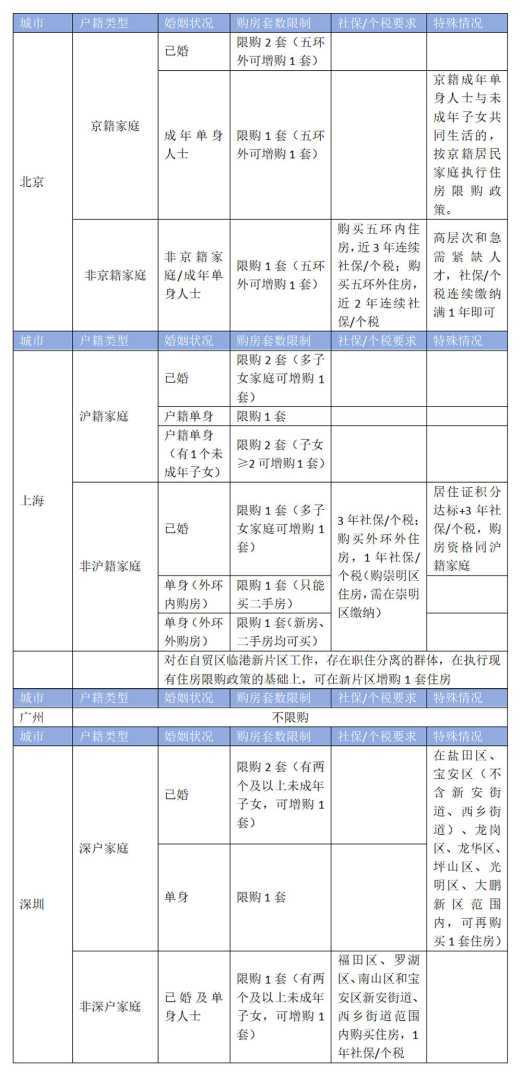 以下是澎湃新闻梳理的一线城市目前仍在执行的购房政策(政策未涉及企业、港澳台、外籍人士等):