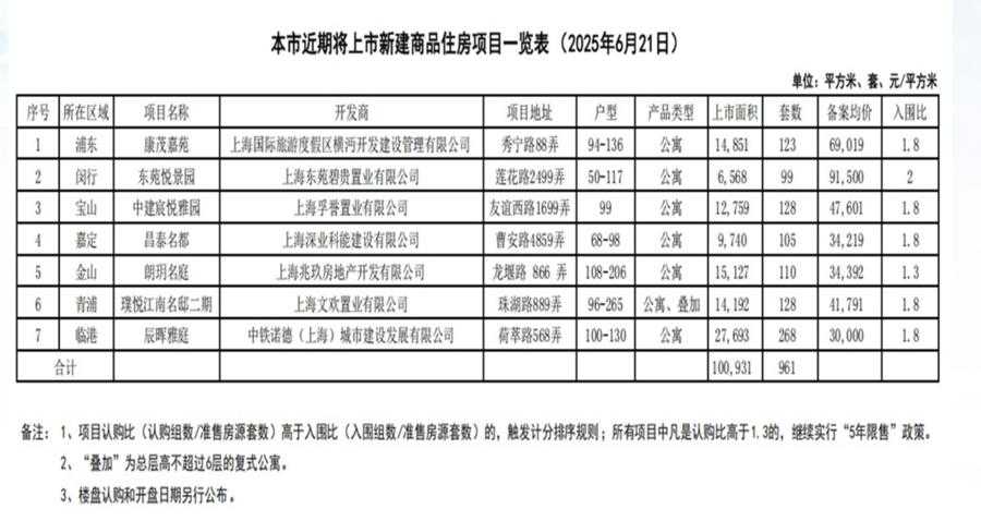 上海房地产市场连续两天“上新”。继6月20日今年第六批次拟出让住宅用地清单公布,市房地产交易中心也在今天(21日)公示了即将入市的新房名单。