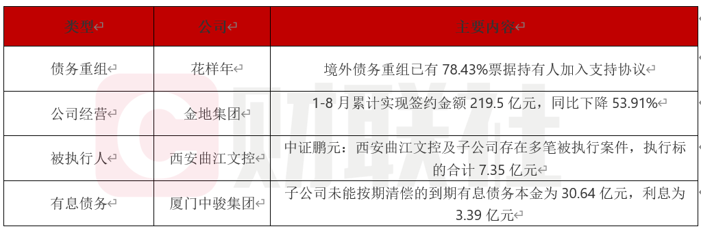 9月3日花样年公告境外债务重组进展,78.43%票据持有人加入支持协议;金地集团1-8月签约金额降53.91%;西安曲江文控及子公司有7.35亿被执行案件;厦门中骏集团子公司有到期债务未清偿,各企业债务与经营情况受关注。