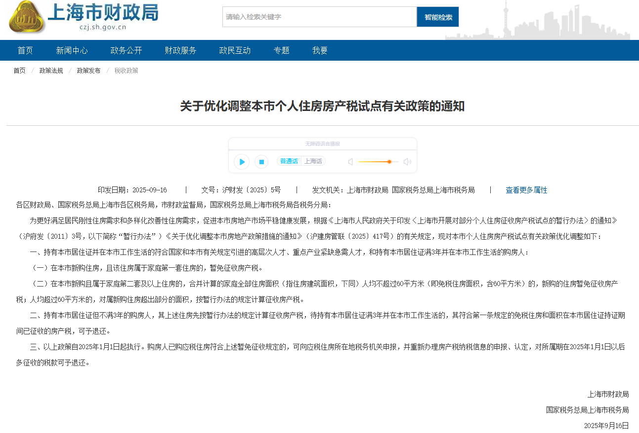 人民网北京9月19日电(记者孙红丽)上海市财政局、国家税务总局上海市税务局日前发布《关于优化调整本市个人住房房产税试点有关政策的通知》(以下简称《通知》),此举对房产税政策进行了重要调整,房产税调整备受关注。《通知》明确,持有上海市居住证满3年并在上海工作生活的购房人,在上海新购住房,且该住房属于家庭第一套住房的,暂免征收房产税。