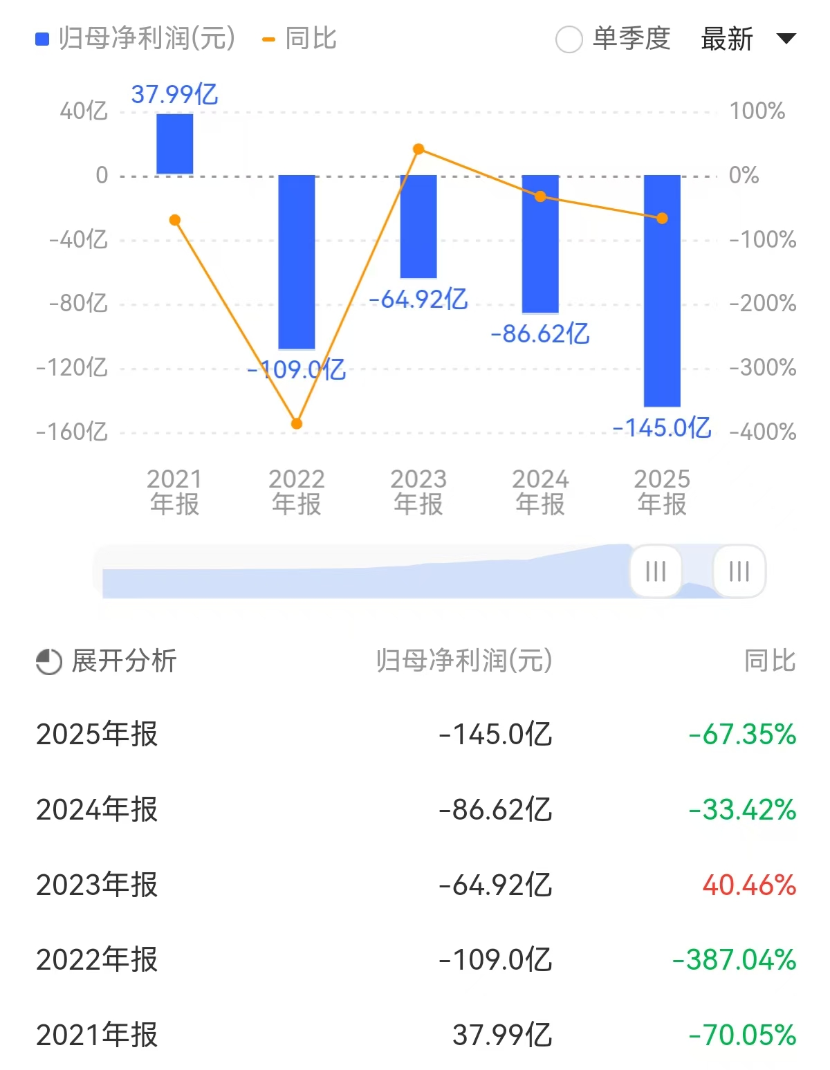 过去的四年,华侨城A业绩连续亏损,2022年至2025年,华侨城归母净利润分别为-109.05亿元、-64.92亿元、-86.62亿元、-145亿元,四年累计亏损达405.59亿元,将公司此前四年(2018至2021年)的净利润全部“吞噬”。